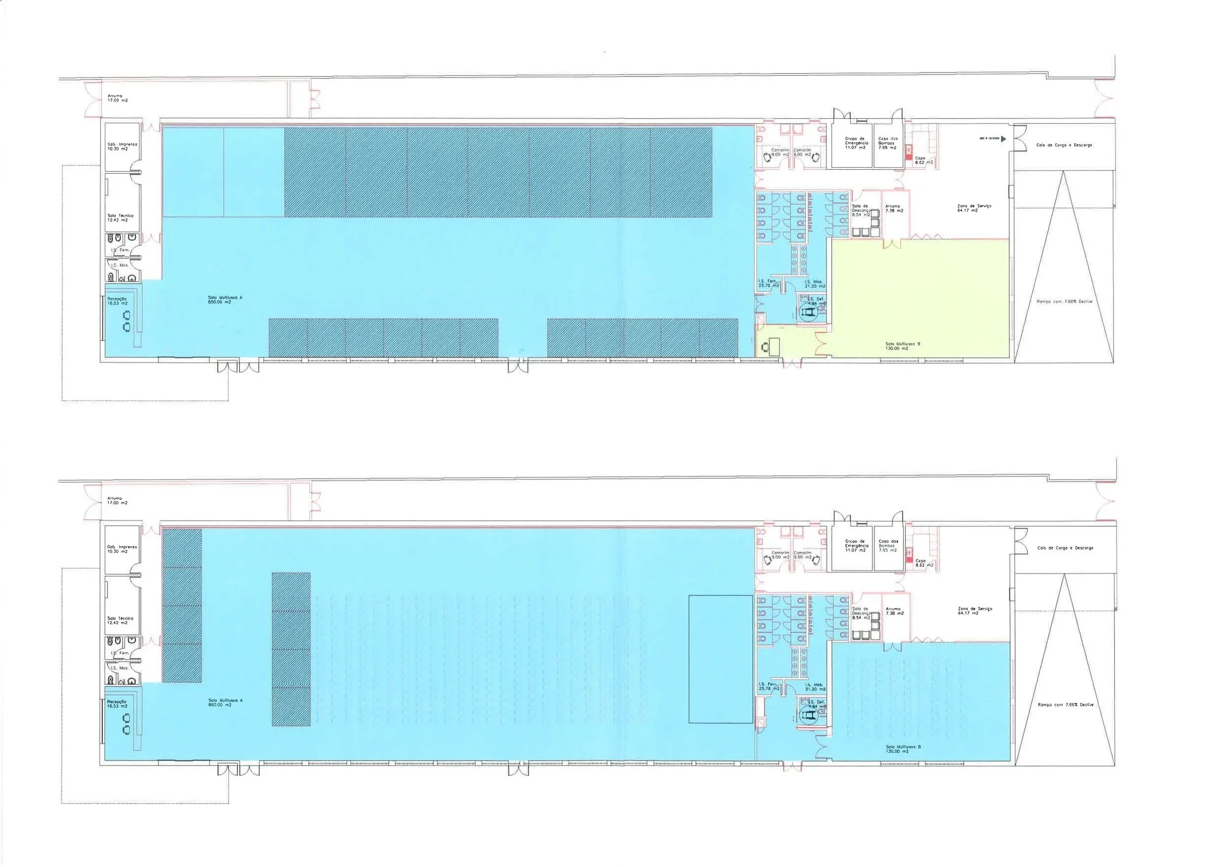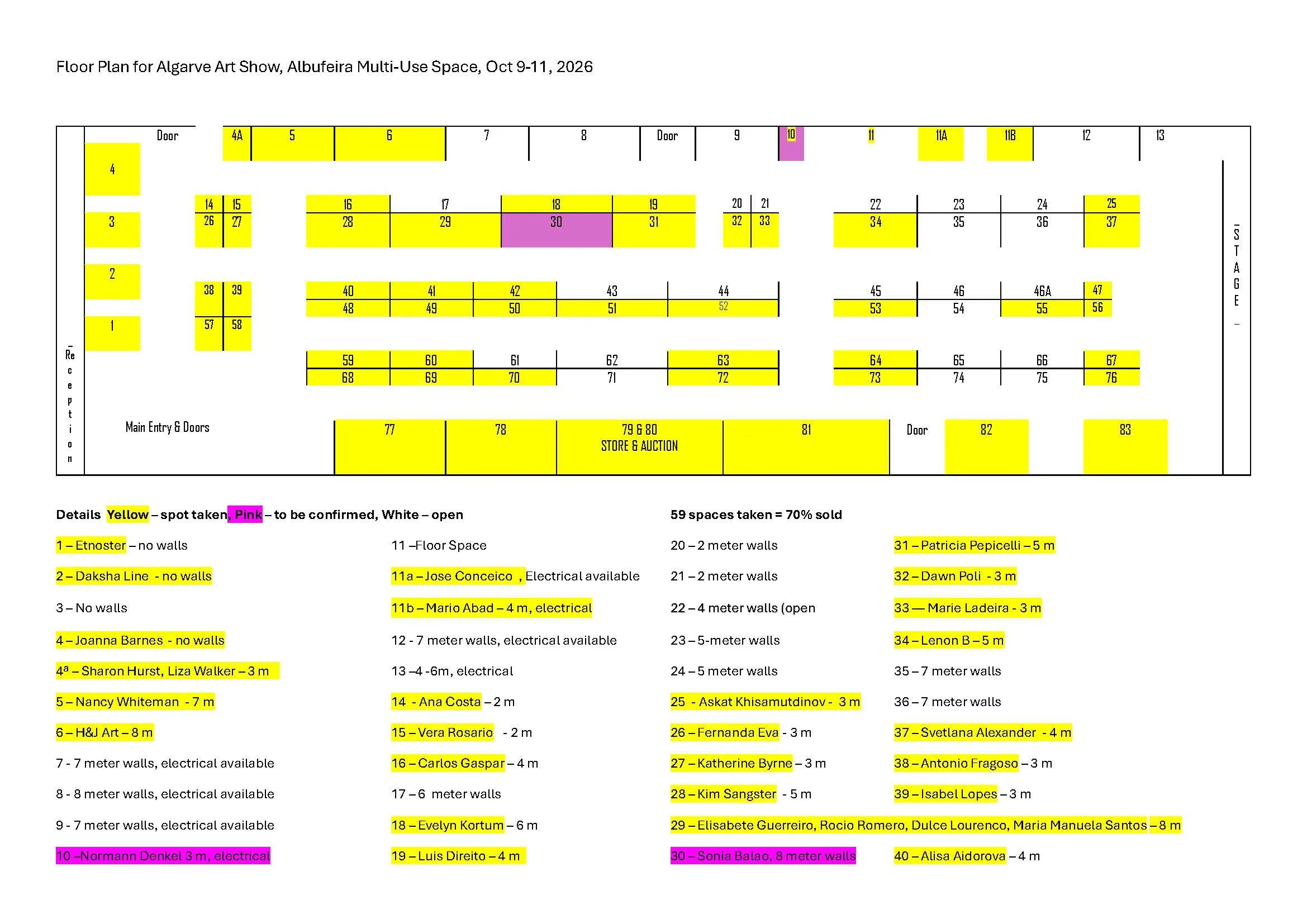 This is the floor plan of the building. The blue areas between the reception on the bottom left and the stage on the right contains the artists stands. The yellow room on the right contains the cafeteria and the w/c’s are between the two rooms. The Albufeira Multi-Use Space is right next door to the Lidl at a major roundabout at R Baden-Powell and Av dos Descobrimentos.